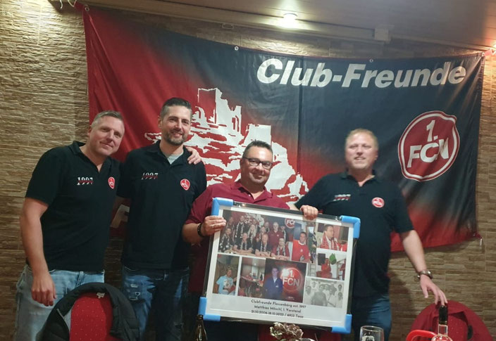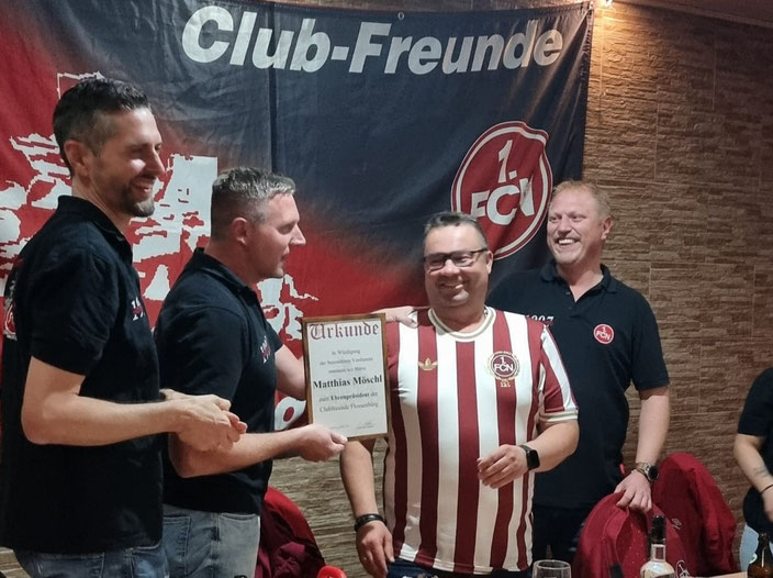Ende des Jahres 1997 im Rahmen der Bezirksweihnachtsfeier im Nachbarort Floss überreichte uns der Bezirkskoordinator Karl Teplitzky unter Anwesenheit des Clubspielers Darius Kampa die offizielle Urkunde zur Anerkennung als Fanclub des 1. FC Nürnberg. Als kleines Zuckerl in Form einer Einladung zu einen ausgiebigen Besuch unseres geliebten Frankenstadions endete der offizielle Teil der Feier.